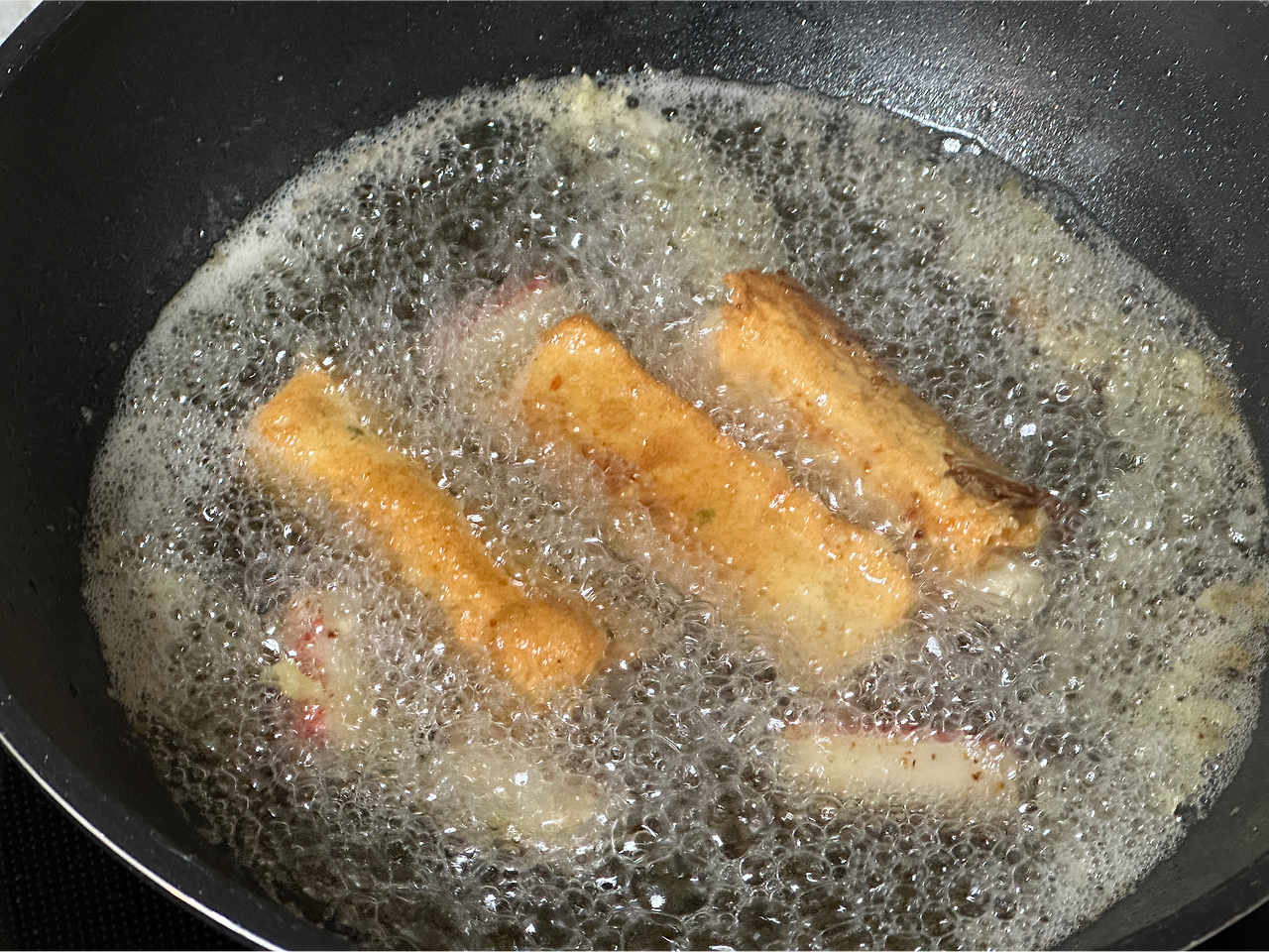 그리고 이어서 어묵도, 음 어묵은 통째로 튀기는 게 낫겠다 싶어서 통재로, 튀김옷을 대강 입혀 후루룩 튀긴다. 따듯한 음식. 가벼운 음식. 가볍고도 즐거운 음식이 오늘의 컨셉이랄까.