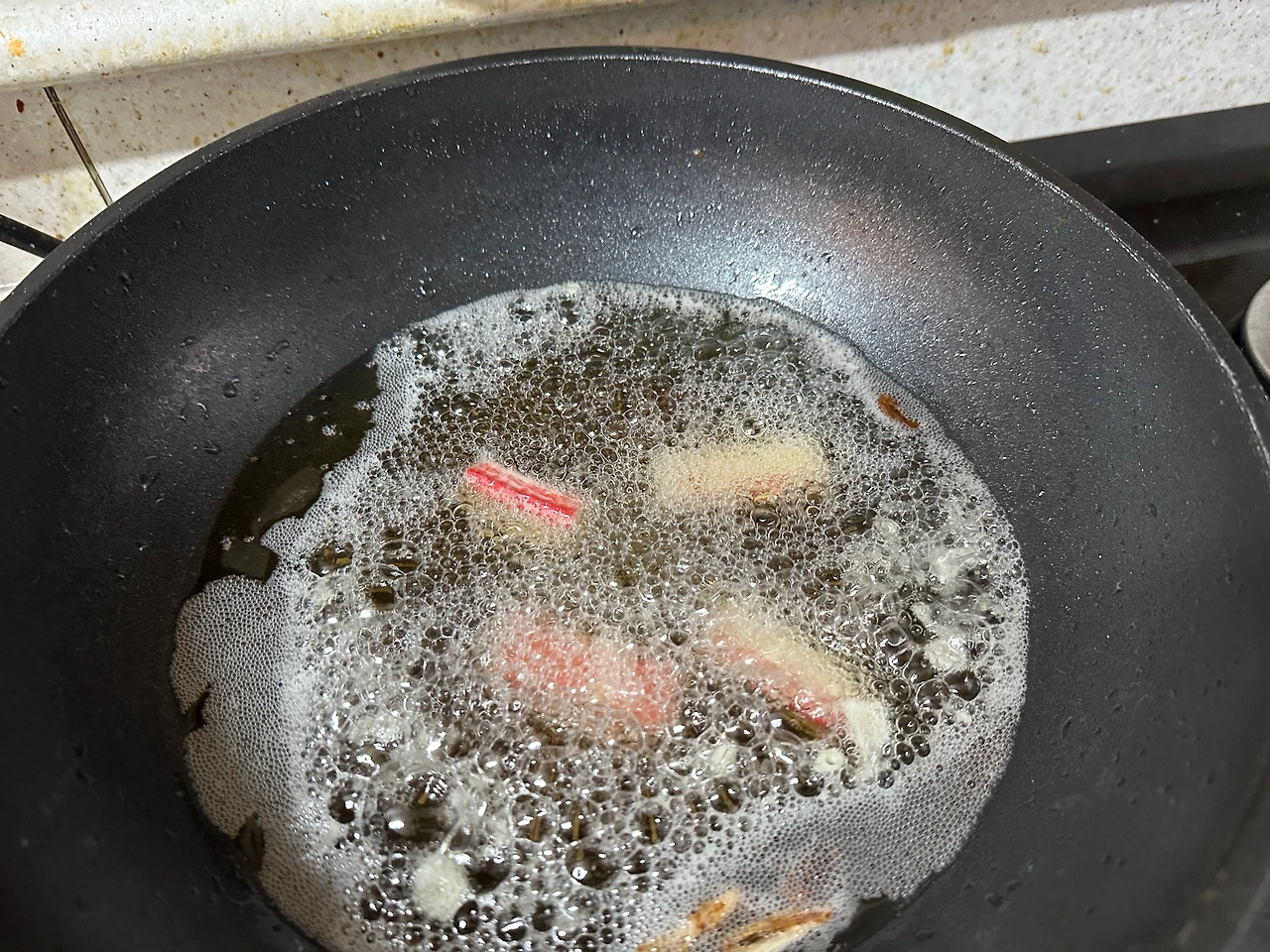 그리하여 나는 집에 와 집을 내려놓자마자 먼저 밥부터 차리기 시작했다. 마침 이틀 전 도래창을 굽고 남은 라드가 한 가득 팬에 아직 남아있다. 이걸로 뭘 할까 고민중이었는데 토요일 아침에 볶음밥을 하긴 했다. 남은 라드로, 튀김을 한바탕 휘리릭한 뒤에 버려버려야지. 바깥양반의 소울푸드 맛살을 꺼내어, 나는 한입 크기로 자르기 시작했다.