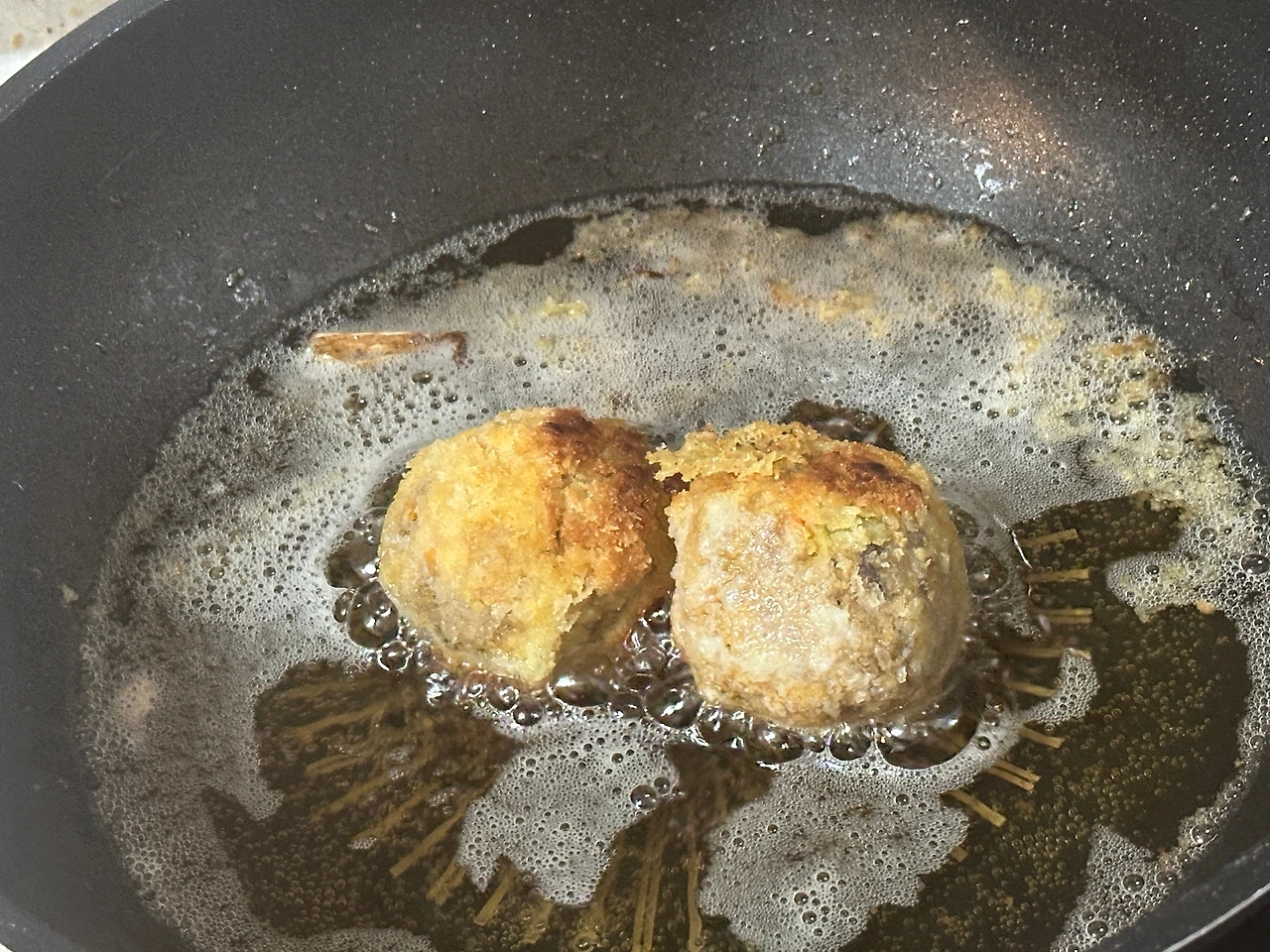 그으-런데에...어묵을 꺼내다보니, 냉동칸에, 예전에 만들었건 아란치니가, 두 알이 마침 있다. 언제 만들었지 이걸 대체. 1년 이내엔 만들지 않았다. 2년쯤 되었으려나. 다행히 밀봉상태가 좋고, 애초에 튀김옷까지 입혀서 얼려둔 거라 상태는 괜찮아보렸다. 나는 파기름을 낸 냄비에 물을 부으면서, 다시 라드 기름에도 불을 켜서 아란치니를 튀기기 시작했다. 바깥양반은 배가 고프고, 이미 오늘의 저녁은 튀김우동으로 정해져있고, 튀김우동에, 라면 스프 건더기 뿐만 아니라 진짜로 튀김을 올려주려는 것이 나의 의지고.