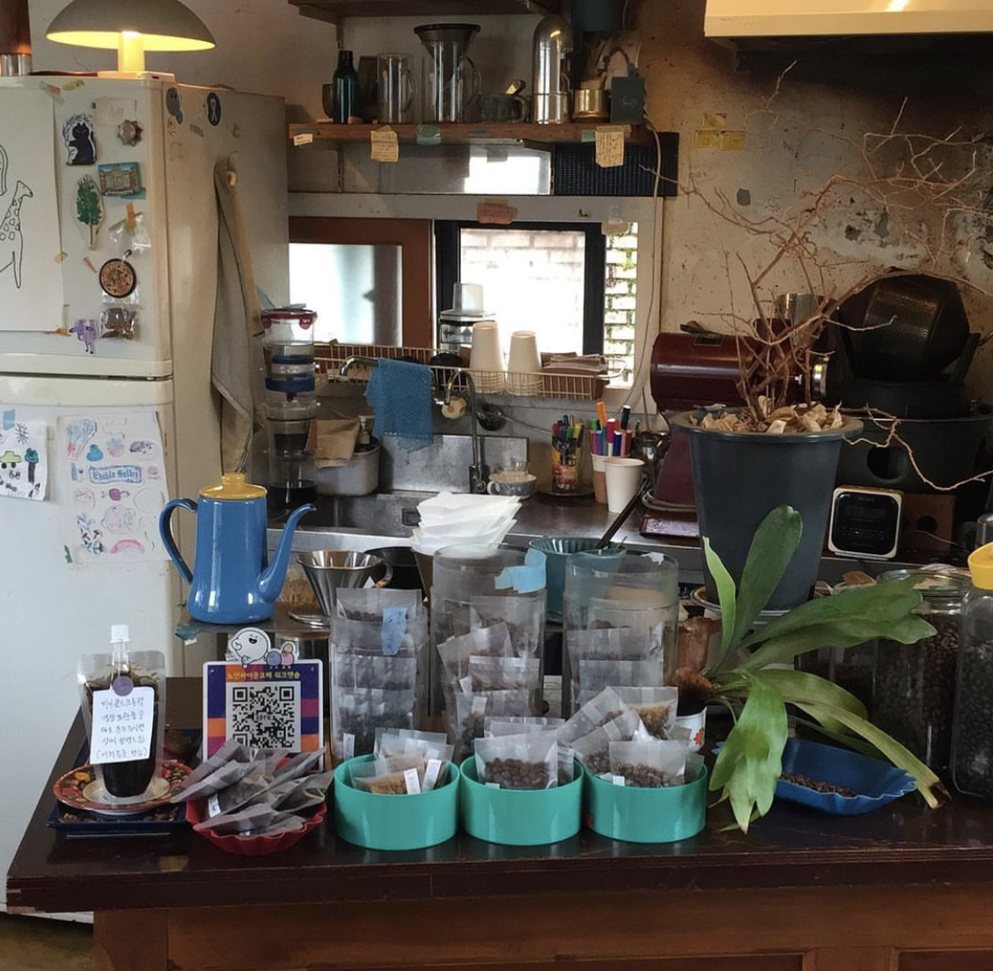 메뉴판 얘기를 더 해 보자. 주인이 손글씨로 작성한 듯한 메모지가 턱턱 붙어 있는 메뉴판에는 금주의 블렌딩 원두가 약 2-3가지 올라와 있다. 첫 방문 때 알게 된 사실은 이곳에선 생두를 직접 팬에 볶는다는 사실이다. 팬에 생두를 볶아 팔 수 있다니 그 사실에 내심 한번 놀랐다. 한 번에 많은 양을 로스팅하지 않기 때문에 작은 볼륨으로 매주 다른 원두를 실험적으로 낼 수 있구나 싶었다.