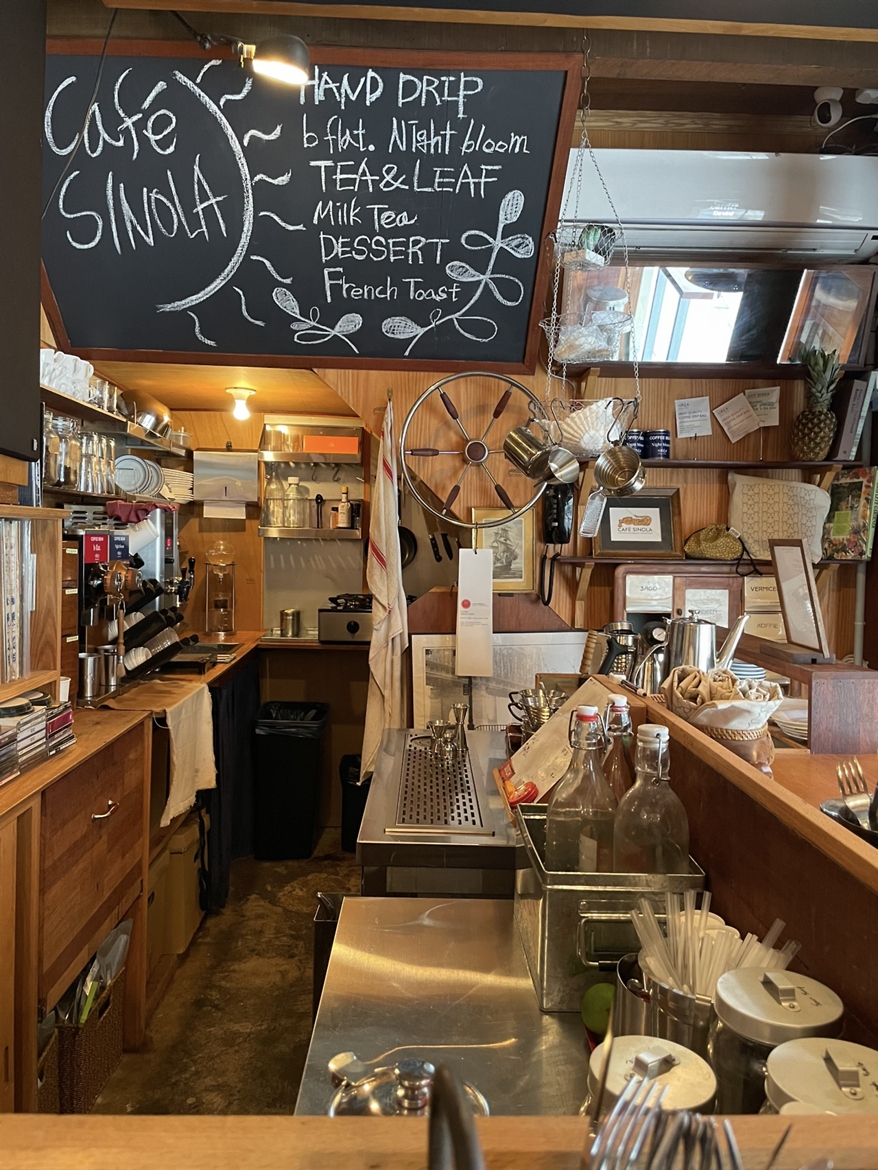 음료를 제조하는 바의 안쪽 공간은 가게에서 가장 특색 있는 공간이다. 이곳을 보고 있으면 마치 선장의 조타실 안을 훔쳐보고 있는 듯한 감상을 자아낸다. 실제로 조타기 모형의 소품이 매달려 있기 때문일까? 자꾸 그쪽으로 눈길이 간다.