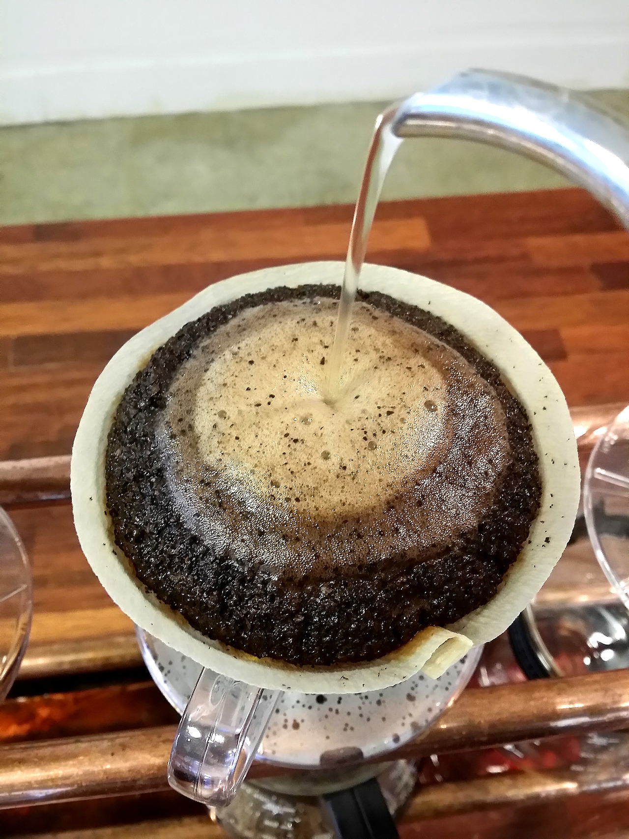 커피의 다공질 속에는 로스팅 과정에서 생성된 이산화탄소가 가득 차 있는데 뜨거운 물을 주입하면 이산화탄소가 배출되면서 커피 가루가 호빵처럼 부풀어 오른다. 우리는 이것을 ‘커피빵’ 혹은 ‘머핀’이라고 부른다. 빵빵해진 커피 가루에 물을 주입하면서 느끼는 즐거움은 한 잔의 커피를 얻기 위한 일련의 과정들을 기꺼이 수용하는 사람만이 누릴 수 있는 특권이다. 로스팅을 한 후 시간이 가면 갈수록 커피 가루가 부풀어 오르는 현상이 잦아드는데 이는 원두를 보관하는 과정에서 다공질 속의 이산화탄소가 점점 빠져나가 버리기 때문이다.