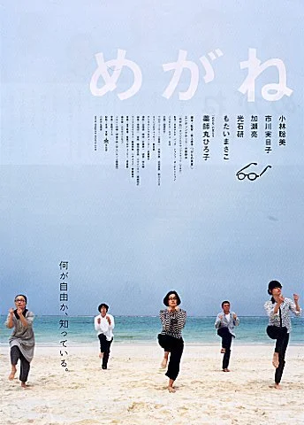 오기가미 나오코 감독이 한국에 왔을 때, 관객들이 왜 영화의 제목이 안경이냐고 묻자 감독은 아무런 의미가 없다고 대답했다.(고 한다.) 아마 오기가미 감독은 관객들이 저마다 느끼는 생각들을 제어하고 싶지 않았을 것이다. 어차피 정답이 있는 것도 아니고 말이다. 설정이겠지만 주요 등장인물들은 안경을 썼다. 그런데 안경을 벗은 모습을 보여주는 건 타에코가 유일하다. 그녀가 잠잘 때와 거의 마지막에서 바람에 안경이 날아갈 때. 그리고 이때마다 그녀는 가장 편안한 표정을 짓는다. 즉, ‘안경’이란 세계를 바라보는 자신의 틀이다. 그리고 사람들은 이 프레임에 스스로 속박 당한다. 그리고 이 속박으로부터의 벗어나기가 바로 ‘젖어들기’다. 오기가미 감독은 전작 <카모메 식당>에선 이러한 속박을 짐으로 표현했었다. 마사코가 잃어버렸고 동시에 찾으려고 했던 그 여행 가방 말이다. 재밌는 건 <안경>에선 거꾸로 마사코가 타에코(카모메에선 사치코)에게 가방을 (내려)놓으라고 눈짓한다. 게다가 타에코가 처음 하마다 게스트하우스에 왔을 때도 유지는 그녀의 가방을 방치했었고. 이처럼 <안경>은 당신이 짐을 내려놓고 함께 식탁에서 밥도 먹고 맥주도 마시고 팥빙수도 먹기를 바란다. <카모메 식당>의 시나몬 롤이 여기선 팥빙수인 셈이다. 자, 당신의 이번 여름 휴가, 팥빙수와 맥주에 흠뻑 젖어들기 바란다! (언제 우연히 만나면 함께 메르시 체조라도 합시다.ㅎ)