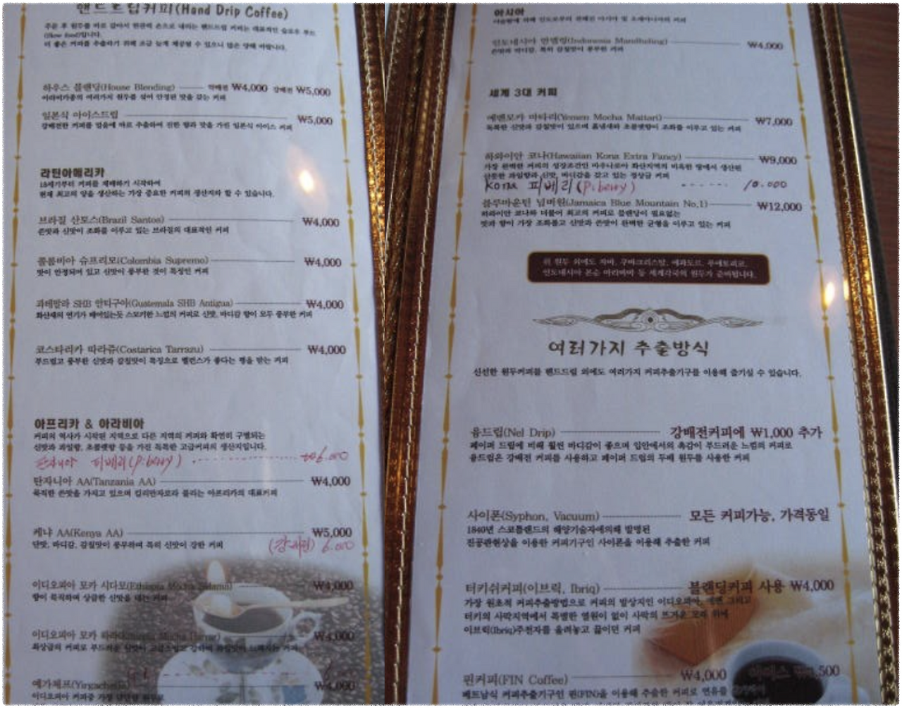 그날 선택한 자메이카 블루마운틴은 한 잔에 12,000원이었는데, 당시 물가를 생각하면 고가의 커피였다.