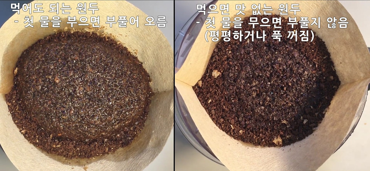 핸드드립 커피를 내리는 경우 첫 물을 부었을 때 왼쪽사진처럼 부풀어 오르는 원두가 맛있는 맛을 내는 원두입니다.