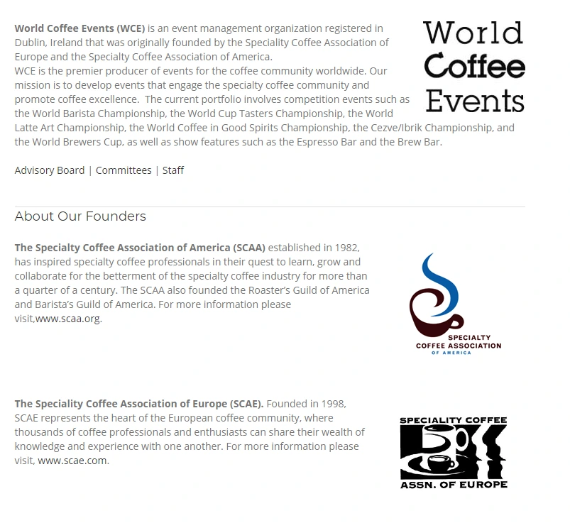 WCE, 월드 커피 이벤트의 약자입니다. 이 또한 말 그대로 다양한 커피 이벤트를 진행하는 단체라고 보시면 되겠습니다. 아일랜드의 더블린에 위치한 이벤트 관리 조직인데요. 앞서 말한 SCAA와 SCAE가 2011년에 SCA로 합쳐지면서 설립된 기관입니다. 이런 WCE에는 다음과 같은 대회와 이벤트가 있습니다. ‘월드 바리스타 챔피언십’, ‘월드 라떼아트 챔피언십’, ‘월드 브루어스컵 챔피언십’, ‘월드 커피 인 굿 스피릿 챔피언십’, ‘월드 컵 테이스터 챔피언십’, ‘월드 커피 로스팅 챔피언십’, ‘체즈베-이브릭 챔피언십’과 같은 대회들과 ‘올-스타즈 이벤트’, ‘Re:co’, ‘Re:verb’와 같은 이벤트도 진행합니다.