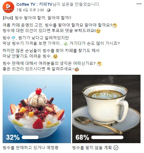 상황이 이러다 보니 빙수 판매를 피하는 카페들이 늘고 있다. 400명이 참여한 빙수 관련 설문조사 결과, 68%의 사람들이 빙수를 팔지 않을 계획이라고 응답했다. 프랜차이즈 카페들은 대부분 빙수를 판매하겠지만 개인 카페들의 경우에는 빙수를 파는 것이 오히려 손해가 될 수 있다고 생각하는 사람들이 그만큼 많은 것으로 보인다.