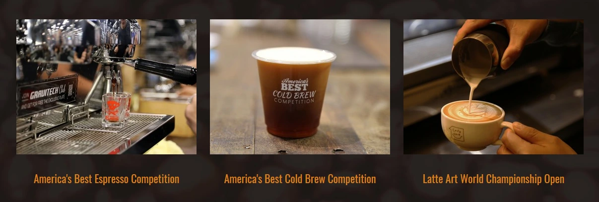 커피 축제에서 빠져서는 안 되는 대회도 준비되어 있습니다. 에스프레소, 콜드 브루, 라떼아트 챔피언십까지 준비되어 있습니다. 특히 최근 들어서 미국에서는 콜드브루에 대한 관심도가 높아지고 있는 것으로 보입니다. 얼마 전 소개했었던 콜드 브루 페스트(지난 글 보기 : https://brunch.co.kr/@coffeetv/19) 역시 미국에서 열렸던 커피 축제입니다. 이처럼 미국에서는 현재 콜드브루에 대해 관심이 높아지는 것을 확인하실 수 있습니다.