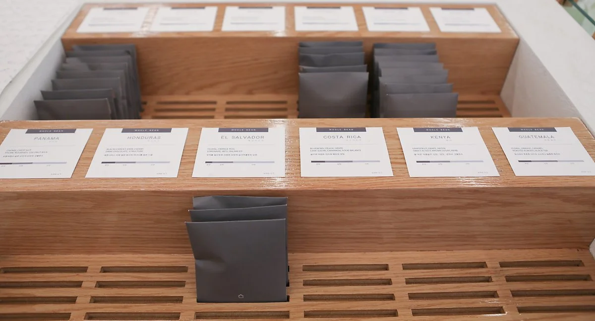 이런 독특한 주문 방식을 위해서 원두는 로스팅 후 20g씩 개별 포장되어 매장에 비치됩니다. 상당히 번거로운 작업임에도 보다 고객들에게 신선한 원두를 제공하기 위해 이러한 방식을 택했다고 하네요. 또한 고객이 직접 선택하고 추출 방식도 선택함으로 해서 단순히 '스페셜티 커피'가 아닌 고객에게 특별히 맞추어진 '스페셜티 커피'를 제공하기 위함이라고 합니다.