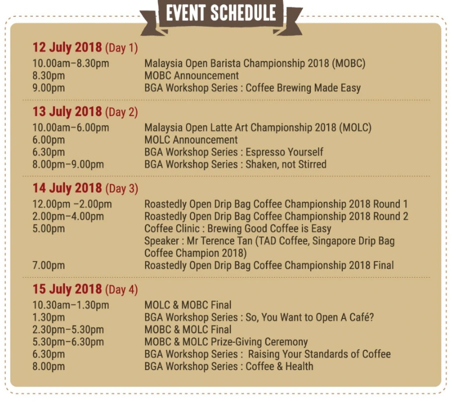 ‘말레이시아 커피 페스트’는 7월 12일에서 15일 4일간 진행된다. 현재 드립 백 커피 챔피언십을 제외하고 다른 대회에 대해 구체적인 정보를 제공하지 않고 있다. 이 로스티드리 오픈 드립백 커피 챔피언십의 우승자에게는 만 오천 링깃, 우리나라 돈으로 450만 원에 해당하는 상금을 부여한다고 한다. 다른 라떼아트, 바리스타 대회 역시 이 이상의 규모로 진행되지 않을까 생각해본다.