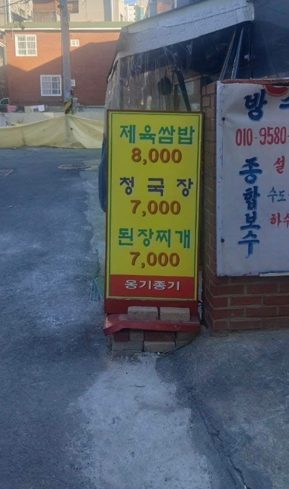 오후 2시 20분. 8시에 아침을 먹었으니 6시간 넘게 공복인 상태다. 허기진 배를 부여잡고 부랴부랴 밥집을 찾아 헤맸다. 서울 도심에 있는 시장 어귀를 어슬렁 거리고 있노라니 무적의 어머니들 그리고 할머니 할아버지들에게 자꾸만 채였다. 밀리고 밀리다가 들어선 샛길. 여긴 어디야 하고 두리번 거리니 안 쪽 구석에 밥집 하나가 보였다. 옳다쿠나. 찐 맛집의 냄새가 난다. 제육쌈밥 8,000원. 청국장 7,000원, 된장찌개 7,000원이라는 노오란 입간판이 나를 반겼다.