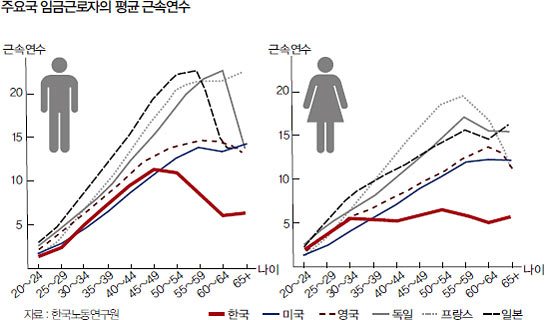주요국 임금근로자의 평균 근속연수 (출처: 한국 노동연구원)