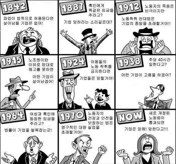 역사적으로 봤을 때, 다수의 피지배계층을 위한 개선의 과정에서 손해를 보는 소수의 지배계층은 언제나 변화에 제동을 걸어왔다. 이들은 혜택을 보지 못한 소수의 스토리를 집중 부각하거나, 부작용을 과장하는 등 미디어를 통해 선동을 해왔다. 노예제 폐지가 그랬고, 성별, 인종 간 임금 차별이나, 노조 결성, 파업, 주 6일제 등 모두 마찬가지였다. 그 당시 기업과 깊은 이해관계가 있던 사람들은, 지금은 당연하게 생각하는 이 변화들을 필사적으로 거부했다.