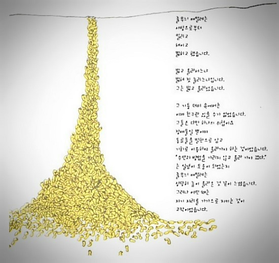 저 또한 마찬가지였습니다. 그렇게 남들이 좋다는 길을 따라가다 보니 우여곡절 끝에 그 길 근처에는 당도한 것 같았는데 어쩐지 마음이 편치 않더라는 것입니다. 분명 남들의 눈에는 순탄하게 성공한 인생을 위한 코스를 차근차근 밟아가고 있는 것처럼 보이지만, 저는 성공한 인생인 것 같다는 생각이 들지 않더라는 거죠. 저만 배부른 소리 하는 것으로 치부하기에는 너무나 많은 또래 친구들이 저와 비슷한 고민을 하는 것을 목격했습니다. 여태까지 우리가 평생 주입받아왔던 이 성공한 인생을 위한 코스가 어쩌면 대형 사기일 수 있다는 생각이 강하게 들었습니다. 제가 고민 끝에 내린 결론은 우리는 모두 속았다는 것입니다. 마치 「꽃들에게 희망을」에 나오는 애벌레들처럼 모두가 한 기둥을 바라보고 그것이 옳은 길이라고 주입받으며 힘겹게 남들과 경쟁하며 목적지에 도달했더니 아무것도 대단할 것이 없었던 것처럼요.