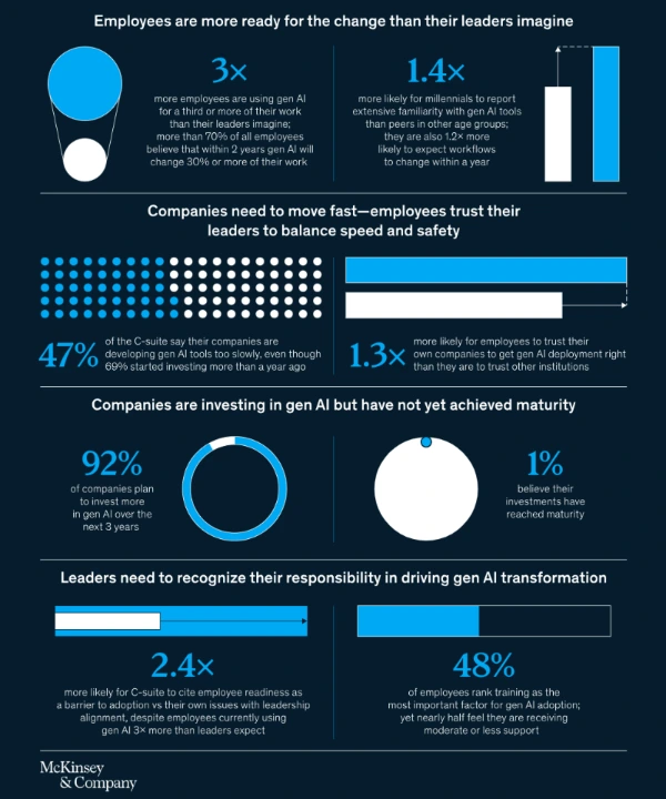 직원들은 AI 도입이 경영진의 주도 아래 체계적으로 진행되기를 기대하고 있지만, 현재 리더들은 이 역할을 충분히 수행하지 못하고 있다.