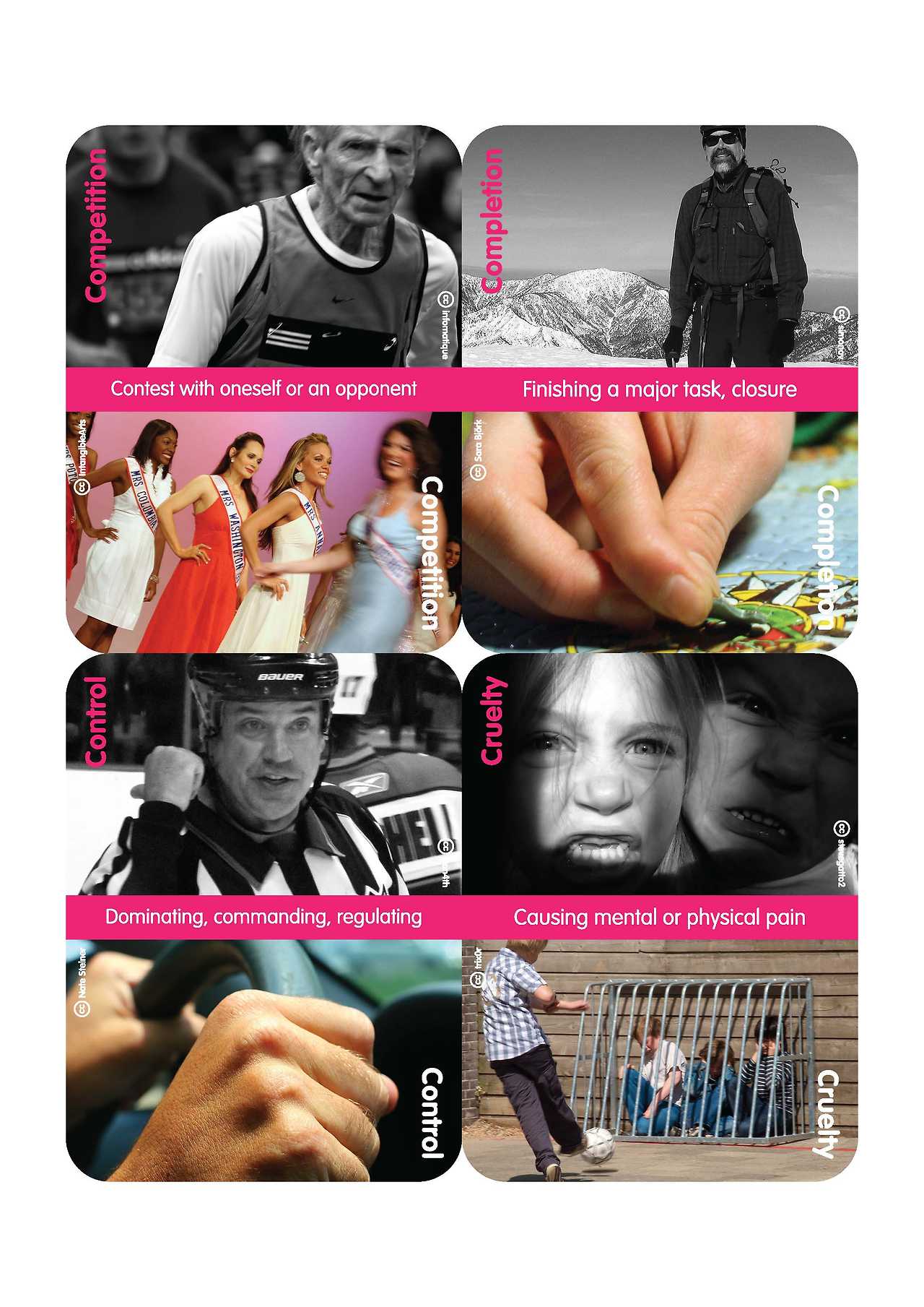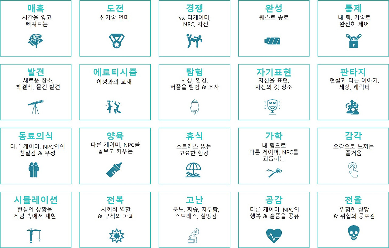 20개 분류는 매혹, 도전, 경쟁, 완성, 통제, 발견, 에로티시즘, 탐험, 자기표현, 판타지, 동료의식, 양육, 휴식, 가학, 감각, 시뮬레이션, 전복, 고난, 공감, 전율입니다.