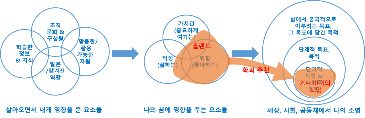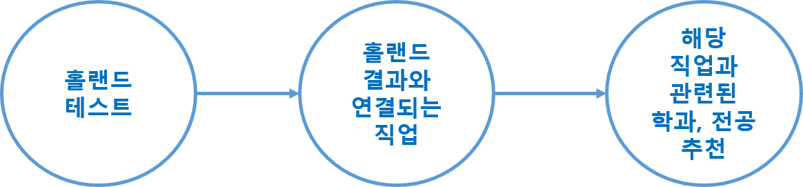 “홀랜드 테스트 -> 연관된 직업 추천 -> 해당 직업을 얻기 위한 대학의 관련 학과, 전공 추천”의 흐름입니다.