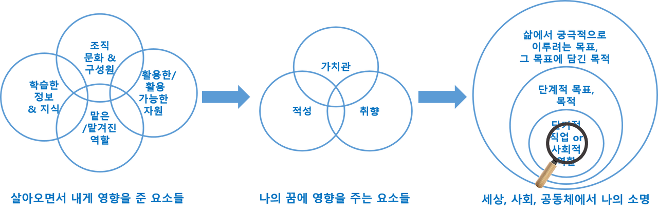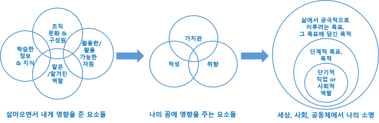 “살아오면서 내게 영향을 준 요소들(과거)”이 지금 “나의 꿈에 영향을 주는 요소들(현재)”을 정립하는데 관련되었으며, 현재 요소들이 “세상, 사회, 공동체에서 나의 소명(미래)”을 꿈꾸게 한다는 것입니다.