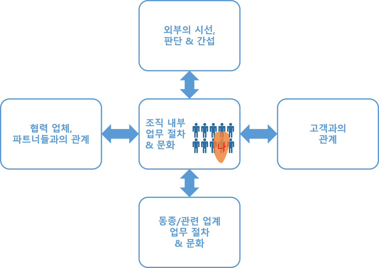 Porter의 모델은 본래 직업 분석과는 무관합니다. 다만, 사회 속 개인을 하나의 기업에 빗대어 생각해보면, 그 개인이 사회 속에서 “어떤 상황에서 어떤 역할을 하는지” 이해하는데 도움이 되지 않을까하는 생각이 들었습니다. 그래서 생각한 모델이 이것입니다.