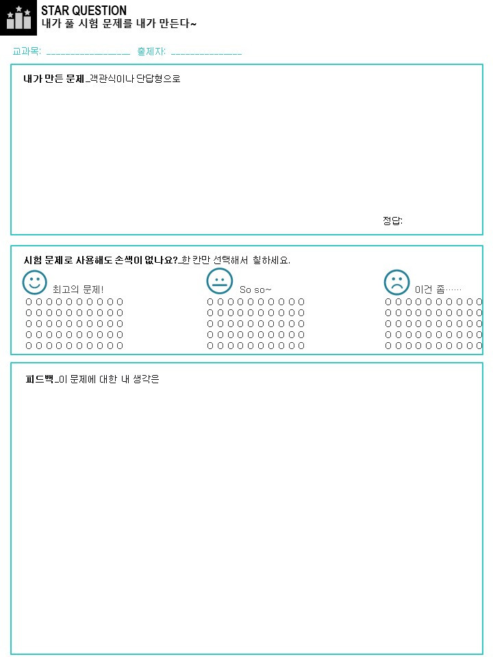 김: 여러 학교에서 교수법 특강을 했을 때, 반응이 좋은 것이 몇 가지 있다. 첫째, 스타퀘스쳔(Star Question) 기법을 권한다. 시험보기 전에 학생들이 시험 문제를 스스로 만들어보는 방법이다. A3 용지를 나눠주고, 이를 삼등분하여, 맨 위에는 학생들이 각자 객관식 문제를 하나 만든다. 이 작업에 대략 20분 정도를 주면 적당하다. 문제가 완성되면, 이를 롤링페이퍼 방식으로 서로 돌려서 풀어본다. 예를 들어, 학생이 30명이라면, 한 학생이 만든 문제를 다른 29명이 돌려가면서 푸는 식이다. 그러면서 A3 용지의 중간 부분에 문제에 대한 평가를 상중하로 체크하고, 하단 부분에 문제에 대한 의견을 한 줄 정도 적으면 된다. 30명 정도가 이렇게 진행하면, 문제를 만드는데 20분, 문제를 돌려서 풀어보는데 30~40분 정도가 소요된다.
