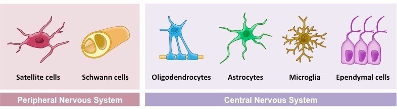 이 세포들은 뉴런을 지지해주거나, 청소하거나, 절연체 myelin sheath의 기능을 하거나, 해로운 외부 물질을 차단시켜주는 혈 뇌 장벽 Blood-Brain Barrier, BBB을 이루는 등 매우 다양한 역할을 합니다. 이전에는 아교세포들이 단순 봉사자의 역할만 하는 줄 알았지만, 최근에는 이들이 적극적으로 신경전달에 참여한다는 것이 정설로서 받아들여지고 있습니다.