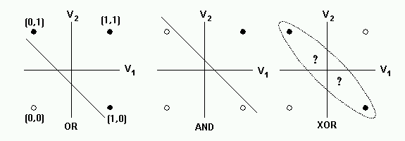 하지만 퍼셉트론 알고리즘은 두 집단을 나누는 수많은 직선 중에 어떤 직선을 골라야 할지에 대해서는 알지 못합니다. 또한 더 다양한 입력을 처리할 수 있는 더 좋은 직선을 만들기 위해 어떻게 수정해야 할지도 알지 못합니다. 이러한 퍼셉트론의 가장 큰 결점은 과연 무엇일까요? 바로 퍼셉트론은 XOR(배타적 논리합)을 표현하지 못한다는 점입니다.