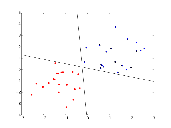 하나의 퍼셉트론은 신경세포와 유사하게 흥분성(양의 가중치) 연결과 억제성(음의 가중치) 연결을 입력받아 입력들의 합이 한계값을 넘으면 1, 그렇지 않으면 0으로 표현합니다. 예를 들어 두 개의 입력 x와 y가 있는 퍼셉트론을 생각해봅시다. 아래와 같이 빨간색과 파란색의 점들이 입력으로 주어지고 그 점들을 색깔에 따라 분류하고 싶다면 우리는 그 사이에 직선을 그을 수 있을 것입니다. 이 직선은 x, y에 대해 어떤 가중치를 가지는 하나의 퍼셉트론으로 표현할 수 있고 우리는 그 퍼셉트론에 x, y를 입력하면 빨간색인지 파란색인지를 출력값으로 알 수 있을 것입니다.