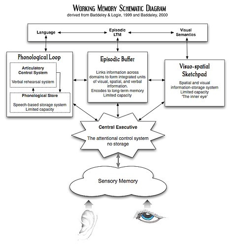 다음으로 알아볼 기억 모형은 앨런 배들리(Alan Baddeley)라는 인지심리학자가 제안한 작업기억 모형입니다. 그가 제안한 작업기억이란 단순히 정보를 저장하는 수동적인 개념이 아니라 일시적으로 정보를 저장하고 그것을 조작하거나 통합하는 역동적인 작업이 포함된 기억의 개념입니다. 앞서 언급했던 애킨슨과 쉬프린 모형에서의 기억은 마치 컨베이어 벨트를 따라 정보들이 수동적으로 들어오는 과정에 가까웠는데요, 작업기억은 들어온 정보들을 역동적으로 조작하고 통합하기 위한 작업 책상에 가깝다고 볼 수 있습니다. 작업기억에 들어온 정보들은 일시적으로 머무르기 때문에 앞서 말한 모형의 단기기억과 유사한 부분이 많습니다. 다만 작업기억에서는 단순히 정보를 저장하는 단기기억과 달리 기억 내용에 대한 인지적 작업이 발생하기 때문에 이 모형은 단기 기억을 확장하고 세분화를 한 것이라고도 볼 수 있습니다.