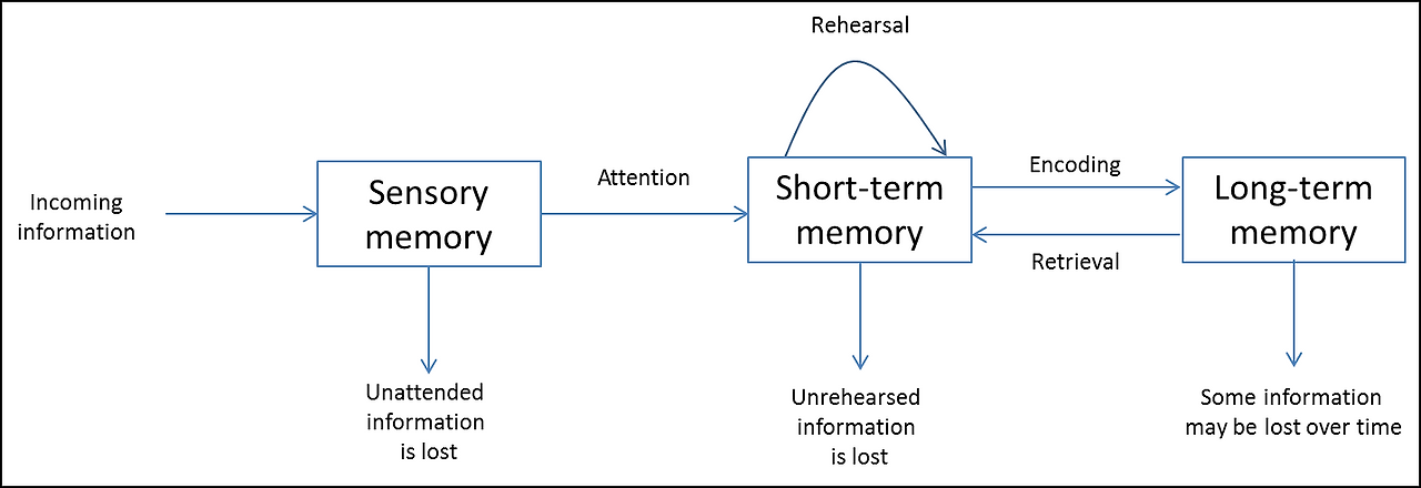 애킨슨과 쉬프린 모형의 가장 큰 특징은 기억을 세 단계의 저장소로 나눈다는 것입니다. 각 저장소는 기억을 유지할 수 있는 시간에 따라 구분되는데, 외부로부터 입력된 정보는 각 단계를 거쳐서 계속 저장되거나 혹은 도중에 망각되어 사라지게 됩니다.