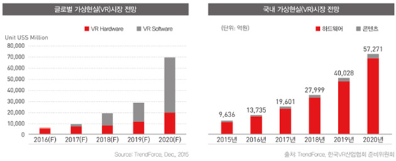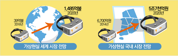 국내 시장규모는 어떨까요? 미래창조과학부에 따르면 VR/AR 시장규모는 지난해 9636억원에서 올해 1조3735억원의 시장규모에 이른다고 합니다. 이러한 추세가 이어질 경우 2020년 우리나라 VR/AR 시장규모는 5조7271억원에 달할 것으로 예상하고 있습니다. 최근 이낙연 총리는 4차산업혁명시대의 먹거리산업으로서 VR시장의 성장을 위해 적극 투자를 지원하겠다고 약속하기도 했습니다.