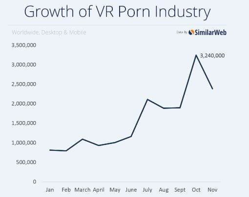 다음의 표는 VR 포르노 산업의 성장을 보여주는데요. x축의 단위가 년(year) 단위가 아닌 월 단위인 것을 확인할 수 있습니다. 이를 통해 우리는 VR 성산업이 엄청나게 빠른 속도로 발전하고 있는 것을 볼 수 있습니다.