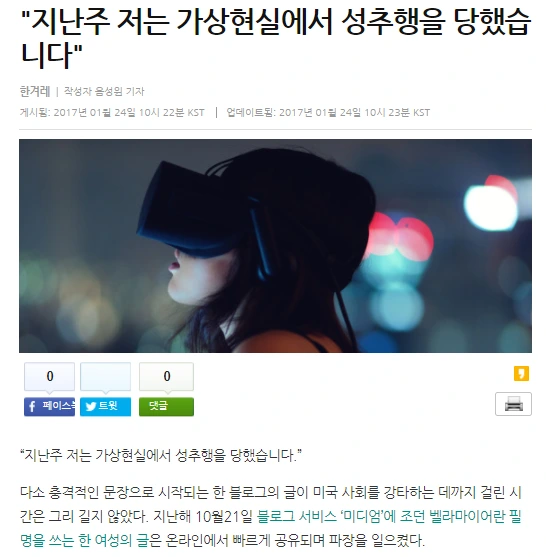 위의 기사는 VR 게임 중에 성추행을 당했음을 고백하는 기사입니다. 실제로 VR 환경에서 성추행이 일어난다면 우리는 어떻게 대처해야 할까요? 가해자는 현실과 같은 기준으로 처벌해야 할까요?