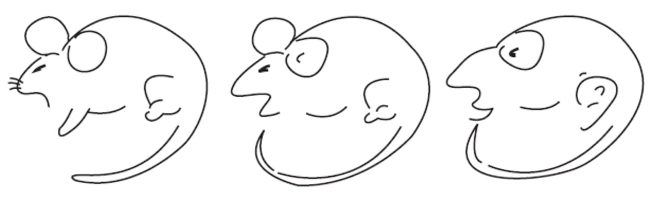 몇 가지 예를 살펴볼까요? 위에 있는 세 개의 그림 중에서, 첫 번째 그림을 제외한 나머지 두 개의 그림을 가리고 보세요. 그리고 가운데 그림을 보세요. 이번에는 세 번째 그림을 보고 가운데 그림을 보세요. 가운데 그림이 각각 무엇으로 보이는지 확인하셨나요? 첫 번째 그림을 보고 가운데 그림을 본다면 가운데 그림은 생쥐로, 세 번째 그림을 보고 본다면 사람 얼굴로 보이는 것을 확인하셨을 겁니다.