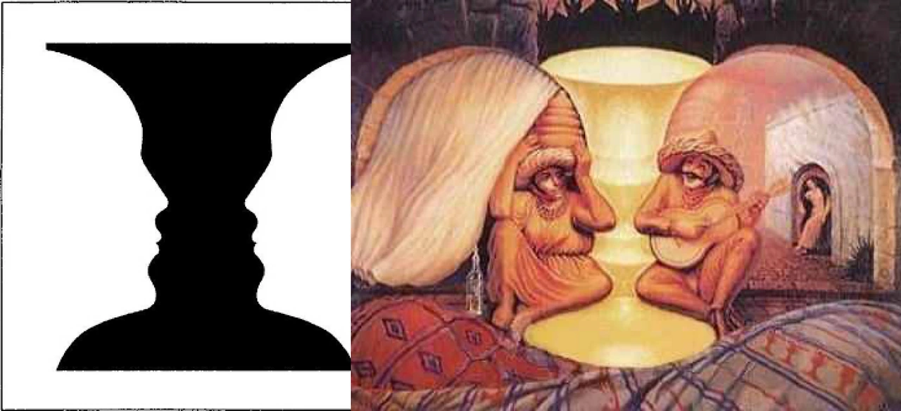 왼쪽 그림은 유명한 face-vase/ Rubin vase 그림입니다. 아시다시피 그림은 두 명의 얼굴과 병으로 보이는데요. 이 그림을 기준으로 하여 오른쪽 그림을 본다면 훨씬 더 수월하게 그림을 예측할 수 있습니다. 오른쪽 그림에서 두 개의 얼굴과 가운데의 꽃병을 볼 수 있죠. 추가적으로 두 명의 연주자도 볼 수 있습니다. 이러한 예를 통하여 우리의 지각 과정은 우리가 기존에 가지고 있던 지식이나 경험에 의해 영향을 받는다는 것을 확인할 수 있습니다.
