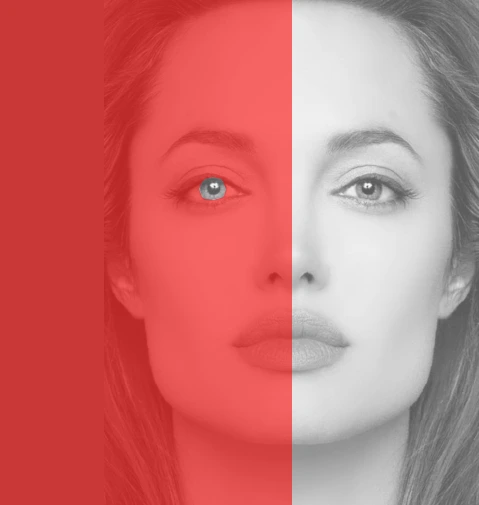 이번엔 다른 예를 볼까요? 안젤리나 졸리의 얼굴 반쪽에 빨간색 필터를 씌워 보았습니다. 양쪽 눈이 서로 다른 색을 띠고 있는 것으로 보이시나요?
