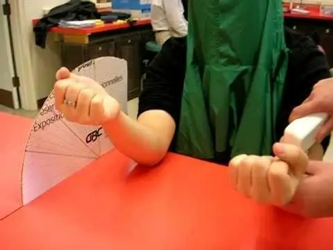 <영상 2>에서 볼 수 있듯이 시각적인 해석을 막기 위해 눈을 가립니다. 수용감각만으로 해석을 하기 위해서입니다. 오른쪽 팔에 각도기를 두고 기준점을 맞추게 됩니다. 진동을 계속 주면서 왼쪽 팔을 움직이면 오른쪽 팔을 그 움직임에 따라 실험 참가자는 자신의 팔 위치를 조절하게 됩니다. 이렇게 진동을 계속 주게 되면 참가자는 왼팔을 따라서 오른팔을 잘 움직이다가, 왼팔을 펴다가 접으면 왼팔을 따라서 접지 않고 오른팔이 반대 방향으로 움직이게 됩니다. 안쪽 인대에 계속 진동을 받게 되면 적응이 되어 팔을 펴다가 접는 정보를 주어도 반대쪽으로 펴고 있다고 착각을 일으키게 되는 것입니다. [코싸인 심리팀]