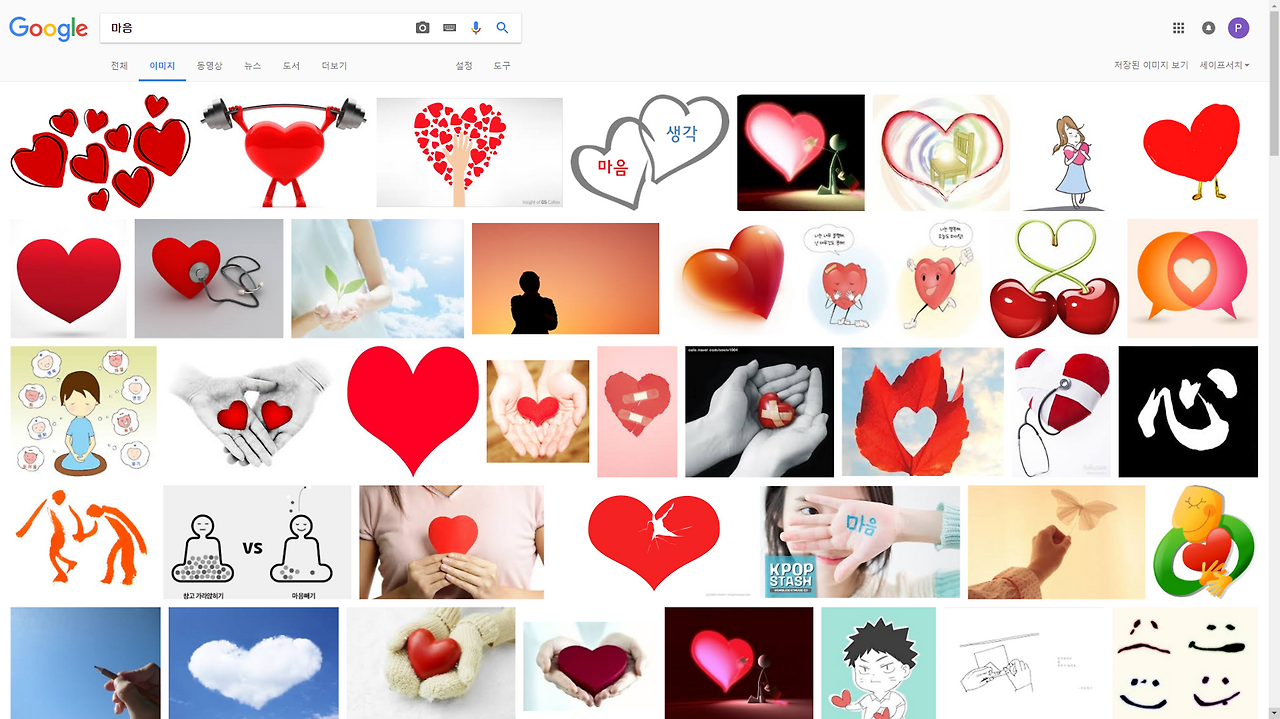 마음이란 무엇일까요? 저번과 마찬가지로 이번에도 구글 이미지에서 검색해보았는데요, 먼저 한글로 '마음'이라고 검색해보았습니다.