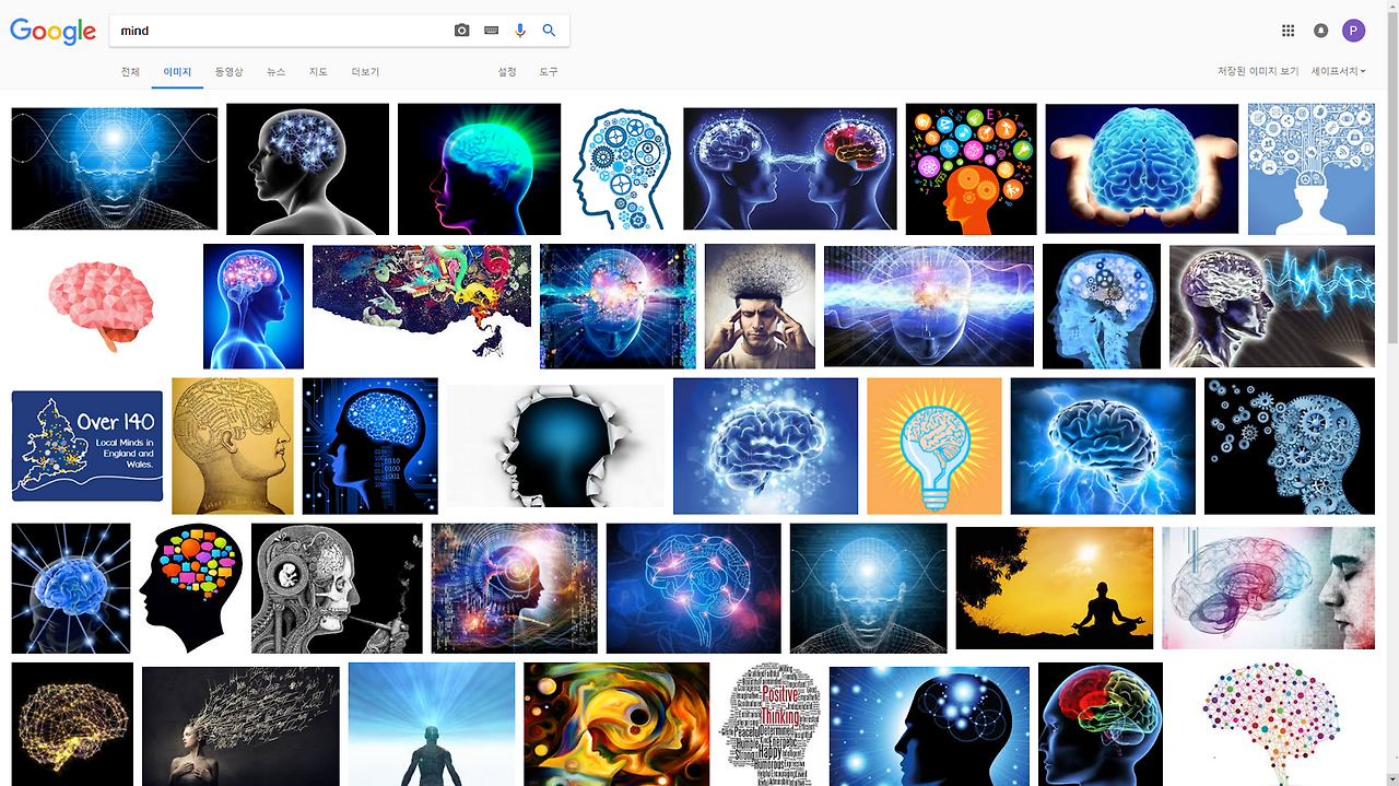 다음으로는 영어로 'mind'라고 검색해보았습니다. 이번에는 아까와 달리 전체적인 색감이 푸르네요. 색감도 확연히 다르지만, 하트가 많이 나왔던 우리말 검색과는 다르게 영어의 mind는 주로 인간의 뇌를 보여주고 있습니다.