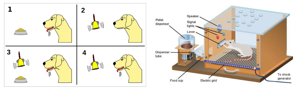 유명한 파블로프의 개 실험에서 종소리와 침 분비는 전혀 상관없는 현상이지만 먹이를 주기 전에 종소리를 들려줌으로써 개의 침 분비와 종소리는 조건화됩니다. 스키너 박스라고 불리는 상자에 들어있는 배고픈 쥐 역시 레버를 눌렀을 때 먹이가 나온다는 사실을 학습하게 되면 레버를 누르는 횟수가 증가하는 결과를 가져오게 됩니다. 이처럼 행동주의에서는 인간이나 동물 내부에서 일어나는 일에 대해서 알지 못해도 마음을 설명할 수 있다고 보았습니다. 행동 자체가 곧 마음인 것이죠. 여러분은 이 생각에 얼마나 동의하시나요? [코싸인]