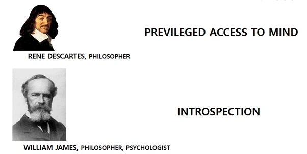 보이지 않는 마음을 어떻게 연구할 수 있을까요? 앞서 나왔던 데카르트에 따르면 우리 스스로가 자신의 마음에 접근하는 특권을 가지고 있기 때문에 마음에 대해 쉽게 알 수 있다고 합니다. 이는 꽤 직관적인 앎이죠. 우리는 다른 사람의 마음을 아는 방법과는 다르게 우리 자신의 마음을 알 수 있다는 것을 압니다. 그러나 이 방법은 객관적인 과학의 방식은 아닌 것 같습니다. 철학자이자 심리학자였던 윌리엄 제임스도 비슷한 맥락의 이야기를 했는데요, 다만 그는 심리학에 정통한 사람이 내성(introspection), 즉 스스로의 마음을 들여다 봄을 통해 마음에 대해 알 수 있다고 했습니다.