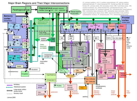 굉장히 복잡해 보이는 [그림 2]의 도표는 계속해서 강조한 뇌의 상호연결성과 동시 활성화의 특징을 단적으로 보여줍니다. 리스만(Lisman)박사가 고안해냈다고 하여 ‘리스만 도표’ 라고 불리는데, 뇌의 주요한 영역과 그 영역들 간의 연결, 그리고 이러한 뇌 연결망을 통해 감각이 입력되고 운동으로 출력되기까지의 과정을 한 도표 안에 나타내고 있습니다. 이 도표에 나온 뇌 영역 이름상자만 무려 100여개에 달하고 이들을 연결한 다양한 종류의 선은 74개가 넘는다고 합니다. 이 글을 읽는 지금 이 순간의 의식작용에만도 가히 얼마나 많은 대뇌 피질의 영역들이 서로 연계되어 동시에 작용하고 있을지를 짐작해보게 하는 대목이지요.