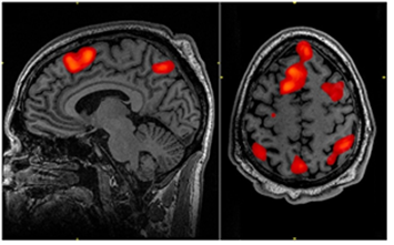 한편, 여러분은 한번쯤 [그림 1]과 같은 뇌 사진을 보셨을 것입니다. 양전자단층촬영(PET)과 더불어 뇌기능을 알아보기 위해 흔히 사용되는 기능적자기공명영상(f-MRI)사진인데요. 외부 자극에 의해 활성화되어 산소나 양분을 공급하기 위해 혈류량이 변화하는 뇌의 영역을 구별되는 색깔로 나타내주고 있습니다. 이러한 신경촬영사진(neuroimage)을 보고 있노라면, 평소 우리 인간의 뇌는 고작 뇌 전체의 10~20% 정도에 불과한 극히 일부만을 사용하는 것 같습니다. 그러나 신경촬영에서는 과학자들이 통계적으로 정한 일정 수준 이상의 뇌 활동만이 표지된다는 점을 잊지 말아야 합니다. 실제로 어떤 특정 정보를 처리하는 과정에서 이에 관여하지 않는 뉴런들도 함께 발화하고 있다는 많은 증거들이 존재하기도 합니다. 즉, 일정 크기 이상의 조건을 충족할 만큼 수많은 대뇌 피질영역들이 동시에 활성화되고, 긴밀히 서로 연결됨으로써 비로소 의식이 가능케 된다는 것이지요.