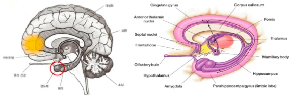 한편, 측두엽에 위치한 해마는 정서의 표현 및 학습에 관계하는 편도체와 맞닿아 있습니다. 그동안 장기기억의 저장중추로 익히 알려져 왔습니다만, 최근에는 해마가 기억을 형성하는 영역이지, 장기적으로 저장하는 영역은 아님이 밝혀졌습니다. 기억이 형성되는 동안은 해마와 신피질(neocortex)이 상호 연결된 상태를 유지하다가, 기억이 장기기억화되면 해마와 신피질 사이의 연결이 끊어지게 되고, 장기기억은 최종적으로 해마가 아닌 대뇌피질에 저장됨을 알게 된 것이지요. 하지만 그렇다고 해서 해마가 기억을 형성하는 데에만 그치는 단순한 장치인 것은 아닙니다. 해마는 지각 정보에 가치를 부여하는 기능 또한 갖고 있어 정보에 따른 적절한 운동실행계획을 수립하는 데 기준을 만들어주기도 합니다.