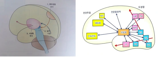 지난 글의 말미에서 어떤 대상에 주의를 기울이기 위한 ‘분리, 이동, 향상’의 세 단계를 언급하며, 이러한 단계별 과정에도 뇌의 다양한 부위가 상호 연결되어 작용한다고 하였습니다. 시각의식을 예로 들면, 시각적 주의집중에는 뇌의 시상침(pulvinar)이라는 부위가 관여합니다. 시상침은 [그림 1]에 나타나있는 것처럼 후두정엽 및 상구와 연계되어 새로운 시각정보에 대한 주의집중상태를 전환·강화시키는 역할을 합니다.