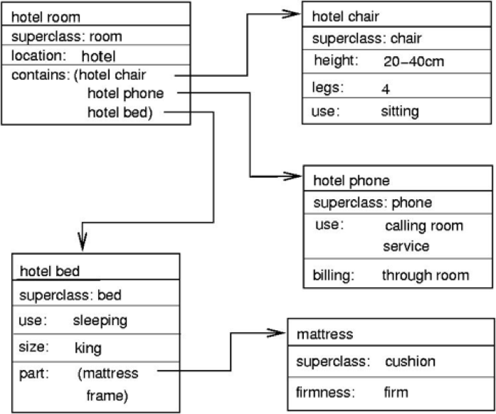 프레임은 MarvinMinsky가 1974년 발표한 개념입니다. 프레임은 개념들을 개념이 같은 데이터와 절차의 뭉치로 표현합니다. 가장 큰 특징은 상속이란 개념을 도입하여, 상위 개념과 하위 개념을 표현할 수 있다는 점입니다. 그림에서는 방의 하위 개념으로 호텔방을 표현했습니다. 그림을 보면 알 수 있듯이 프레임은 어쩌면 의미망의 일종일지도 모르겠다고 생각될 정도로 의미망과 유사한 모양을 갖습니다.