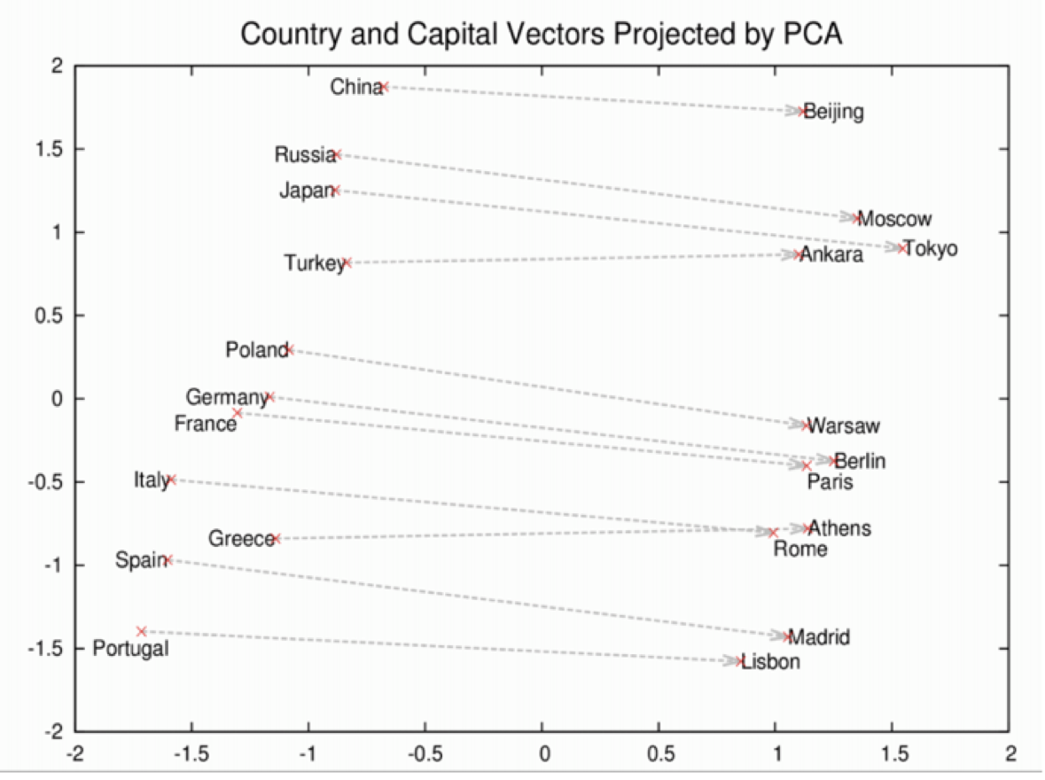 이러한 워드 임베딩 과정을 거치고 나면, 인간이 임의적으로 배치에 손을 쓰지 않았음에도 신기한 특징이 나타나게 됩니다. 그림은 워드 임베딩 된 단어들을 우리가 보기 쉽도록 2차원으로 축소하여 표현한 것입니다. 먼저 나라 이름들과 도시 이름들은 비슷한 맥락에서 사용되므로, 저들끼리 군집을 이룬 것을 확인할 수 있습니다. 여기서 신기한 점은 단어들 간의 관계까지 표현이 되었다는 점입니다. 각 나라와 수도 간의 상대 위치가 유사함을 알 수 있습니다. 이러한 규칙성을 통해 ‘일본에게 도쿄는 한국에게 어디?’라는 질의를 수행할 수도 있고, 서울이라는 답을 얻을 수도 있습니다.