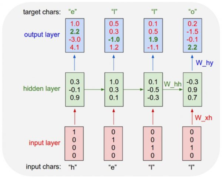 워드 임베딩과 뉴럴 네트워크가 결합하면 다양한 자연어 처리 작업을 수행할 수 있습니다. 뉴럴 네트워크 중 RNN(Recurrent Neural Network)은 순서가 있는 데이터를 처리하기가 용이하여 글자의 나열인 텍스트를 처리할 때도 유용합니다. 그림은 RNN으로 구현한 다음 알파벳 예측기입니다. 일반 뉴럴 네트워크 모델은 같은 Input에 대해 선 같은 output을 갖게 됩니다. 이와 달리 RNN에서는, ‘hello’를 학습시킬 경우 첫 번째 l이 input일 경우 l, 두 번째 l이 인풋일 경우 o를 output으로 가지며 맥락을 통해 정확하게 다음 단어를 예측하는 것을 보실 수 있습니다.