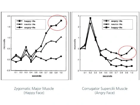 이후 기쁜 표정과 화난 표정, 각각의 표정이 보여지는 시점에서 발생하는 피험자 얼굴 근육의 변화를 EMG(ElectroMyoGraphic)로 측정하였습니다. 위의 측정결과를 살펴보면, 왼쪽 그래프의 Zygomatic major muscle, 즉 입술을 끌어올리는 광대근육은 기쁜 표정이 주어졌을 때 활성화가 가장 높고, 화난 표정이 주어졌을 때 활성화가 가장 낮게 이루어진 것을 알 수 있습니다. 반면, 오른쪽의 Corrugator supercilii muscle, 즉 미간을 찡그리는 근육은 화난 표정이 주어졌을 때 활성화가 가장 높고, 기쁜 표정이 주어졌을 때 활성화가 가장 낮게 측정되었습니다.