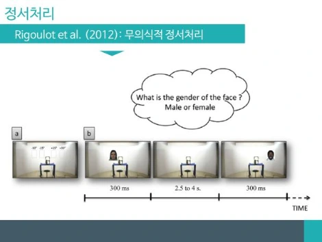 정서와 관련해 소개할 두 번째 연구 또한 무의식적인 정서 정보가 어떻게, 그리고 어떤 수준으로 처리되는지를 살펴본 ‘무의식적 정서처리’에 관한 실험입니다. (Rigoulot et al.,2012) 이 연구 역시, 앞서 봤던 실험과 비슷하게 기쁜 표정(happy face), 무표정(neutral face), 무서운 표정(fear face)의 세가지 자극을 사용했습니다.