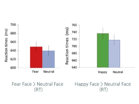그림7: 주어진 자극을 구별하는데 소모된 반응시간의 차이 (Rigoulot et al,2012).